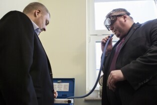 Otwarcie Pogotowia Socjalnego dla Osób Nietrzeźwych przy ul. Srebniki w Gdańsku. Nz. Z-ca Prezydenta Gdańska Piotr Kowalczuk w alkogoglach wciela się w rolę pacjenta ośrodka, po lewej kierownik placówki Sławomir Kunkel