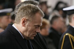 Gdańsk, Bazylika Mariacka. Pogrzeb Marszałka Macieja Płażyńskiego, który zginął w katastrofie samolotu prezydenckiego pod Smoleńskiem. Nz. Premier RP Donald Tusk