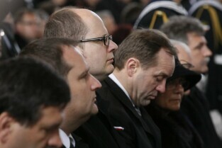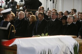 Gdańsk, Bazylika Mariacka. Pogrzeb Marszałka Macieja Płażyńskiego, który zginął w katastrofie samolotu prezydenckiego pod Smoleńskiem. Nz. od lewej: Lech Wałęsa, Małgorzata Tusk, Donald Tusk, Bronisław Komorowski, Bogdan Borusewicz