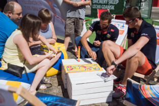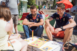 Gdańsk, Targ Węglowy. Pokaz siatkarskiego pucharu Mistrzostw Europy. Nz. Mateusz Mika i Szymon Jakubiszak