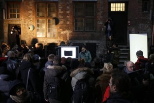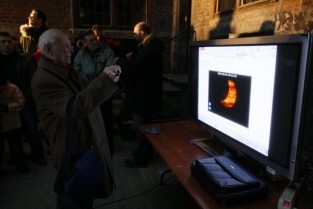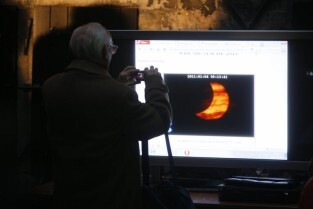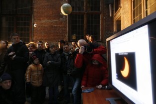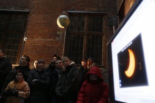 Pokaz zaćmienia Słońca zorganizowany na dziedzińcu Ratusza Głównego Miasta w Gdańsku. Niestety duże zachmurzenie nie pozwoliło na oglądanie "lokalnego" zaćmienia, dlatego na monitorze pokazano obraz z obserwatorium pod Rzymem