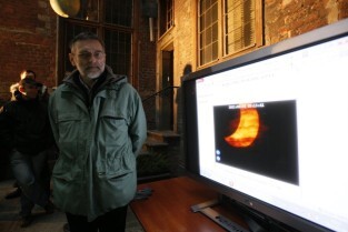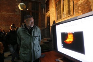 Pokaz zaćmienia Słońca zorganizowany na dziedzińcu Ratusza Głównego Miasta w Gdańsku. Niestety duże zachmurzenie nie pozwoliło na oglądanie "lokalnego" zaćmienia, dlatego na monitorze pokazano obraz z obserwatorium pod Rzymem. Nz. Z-ca Dyrektora MHMG dr inż. Grzegorz Szychliński, który opowiadał o tym zjawisku