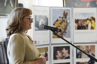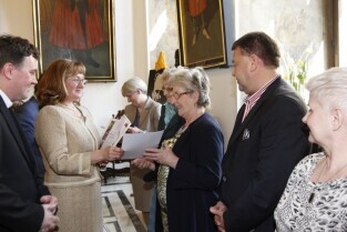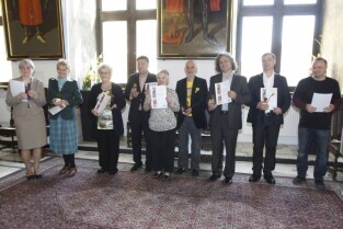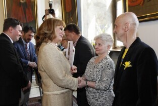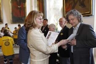 Pola Nadziei w Gdańsku. Akcja charytatywna polegająca na zbiórce przez wolontariuszy pieniędzy na działalność hospicyjną. Uroczystość nadania dziesięciu osobom tytułów Honorowego Wolontariusza. Gdańsk, Ratusz Głównego Miasta. Nz. tytuł otrzymuje fotoreporter Maciej Kosycarz