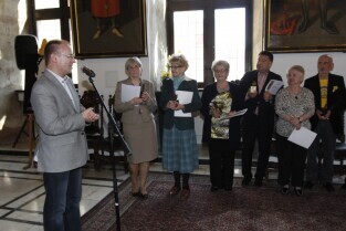 Pola Nadziei w Gdańsku. Akcja charytatywna polegająca na zbiórce przez wolontariuszy pieniędzy na działalność hospicyjną. Uroczystość nadania dziesięciu osobom tytułów Honorowego Wolontariusza. Gdańsk, Ratusz Głównego Miasta. Nz. przemawia Z-ca Prezydenta Gdańska Maciej Lisicki