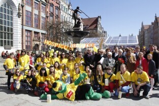 Pola Nadziei w Gdańsku. Akcja charytatywna polegająca na zbiórce przez wolontariuszy pieniędzy na działalność hospicyjną. Wspólne zdjęcie wolontariuszy. Gdańsk, Droga Królewska