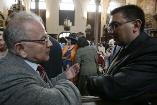 Gdańsk, Dwór Artusa. Spotkanie byłej Polonii Gdańskiej w ramach III Zjazdu Gdańszczan. Nz. Prof. Andrzej Januszajtis (po lewej) i Piotr Mazurek Prezes Towarzystwa Przyjaciół Gdańska