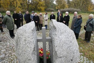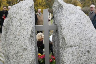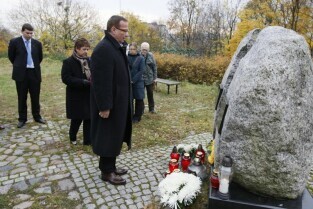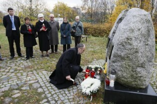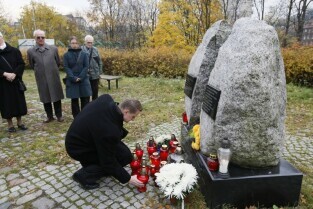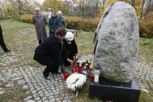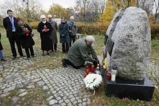 Zapalenie zniczy pod pomnikiem Ofiar Tyfusu. Gdańsk, park Grodzisko. Nz. gdański radny Marek Bumblis