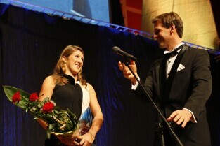 Pomorska Gala Żeglarstwa, podczas której nagrodzono sportowców i organizatorów imprez żeglarskich. Gdańsk, Filharmonia Bałtycka. Nz. nagroda w kategorii Juniorka Roku, którą otrzymuje Agnieszka Bilska. Po prawej Mateusz Kusznierewicz