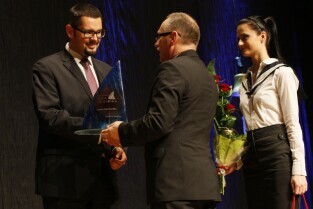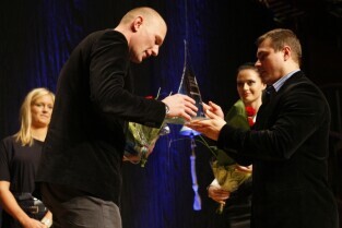 Pomorska Gala Żeglarstwa, podczas której nagrodzono sportowców i organizatorów imprez żeglarskich. Gdańsk, Filharmonia Bałtycka. Nz. nagroda w kategorii Żeglarz Roku, którą otrzymuje Piotr Myszka