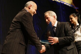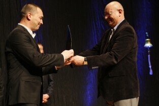Pomorska Gala Żeglarstwa, podczas której nagrodzono sportowców i organizatorów imprez żeglarskich. Gdańsk, Filharmonia Bałtycka. Nz. nagroda w kategorii Żeglarska Osobowość Roku, którą otrzymuje Zbigniew Gutkowski, a wręcza Dyrektor Biura Prezydenta Gdańska ds. Sportu Andrzej Trojanowski