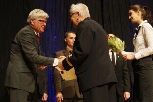 Pomorska Gala Żeglarstwa, podczas której nagrodzono sportowców i organizatorów imprez żeglarskich. Gdańsk, Filharmonia Bałtycka. Nz. nagroda w kategorii Żeglarz Roku, którą otrzymuje Piotr Myszka, a wręcza Prezydent Gdańska Paweł Adamowicz