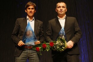 Pomorska Gala Żeglarstwa, podczas której nagrodzono sportowców i organizatorów imprez żeglarskich. Gdańsk, Filharmonia Bałtycka. Nz. od lewej: Piotr Myszka i Zbigniew Gutkowski