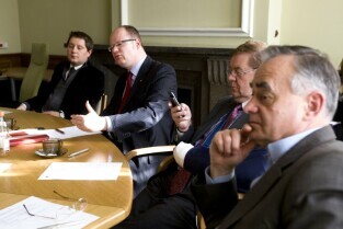 Gdańsk, Pomorski Urząd Wojewódzki. Spotkanie Pomorskiego Komitetu Organizacyjnego UEFA EURO 2012 w Gdańsku. Nz. od lewej: Wojewoda Pomorski Michał Owczarczak, Prezydent Gdańska Paweł Adamowicz, Prezes Spółki BIEG2012 Ryszard Trykosko, Zbigniew Canowiecki