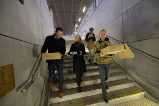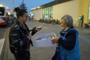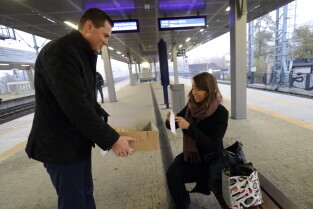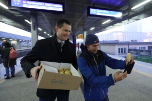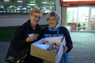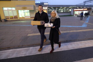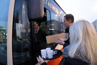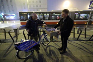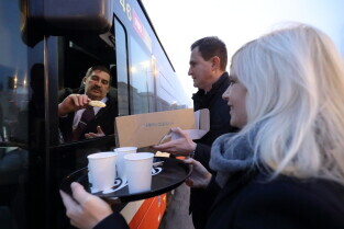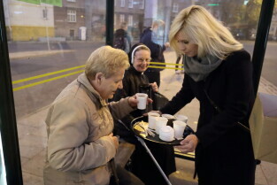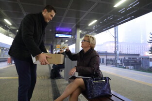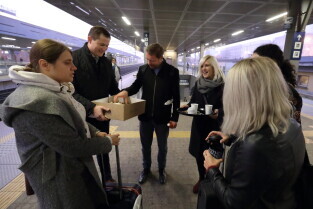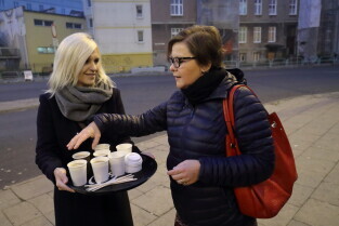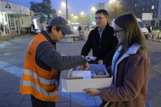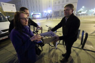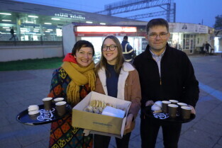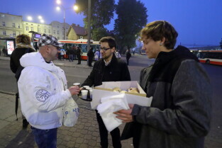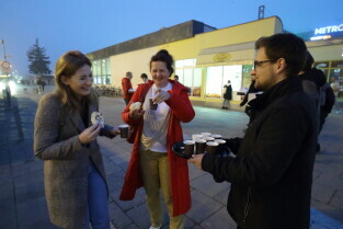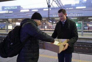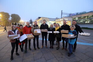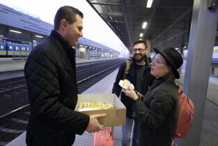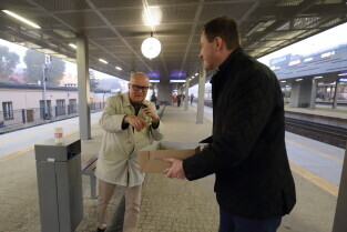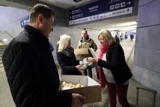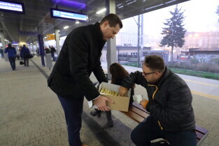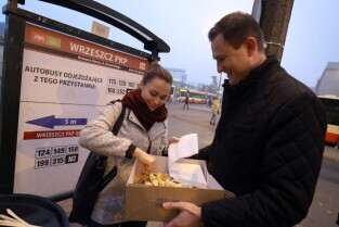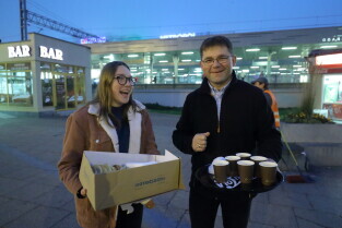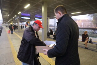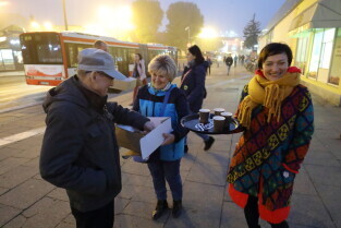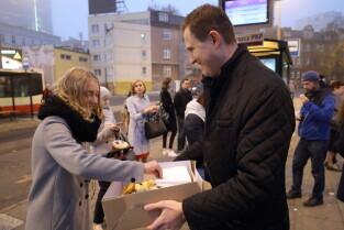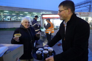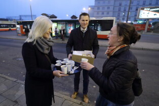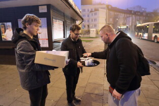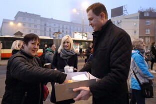 Gdańsk, okolica dworca PKP Gdańsk Wrzeszcz. W podziękowaniu za wysoką frekwencję wyborczą - poranna kawa i drożdżówki dla gdańszczan z udziałem Wiceprezydenta Piotra Grzelaka, gdańskich radnych i wolontariuszy.