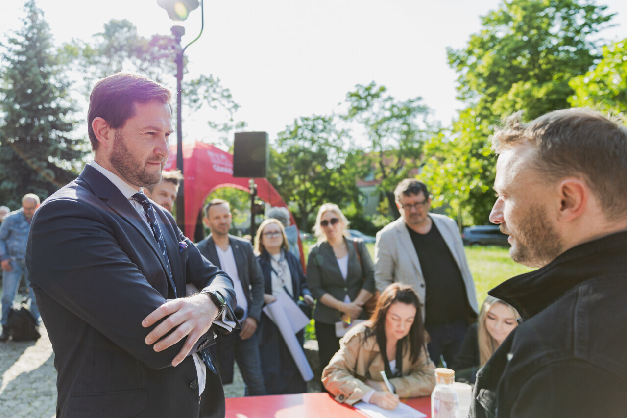 Gdańsk, plac gen. Stanisława Maczka u zbiegu ulic Chopina i Wojska Polskiego. Porozmawiajmy przy stole o dzielnicy Strzyża. W spotkaniu brali udział Aleksandra Dulkiewicz, prezydent Gdańska, zastępcy prezydenta oraz dyrektorzy wydziałów i miejskich jednostek organizacyjnych, a także radni miejscy i radni dzielnicy.