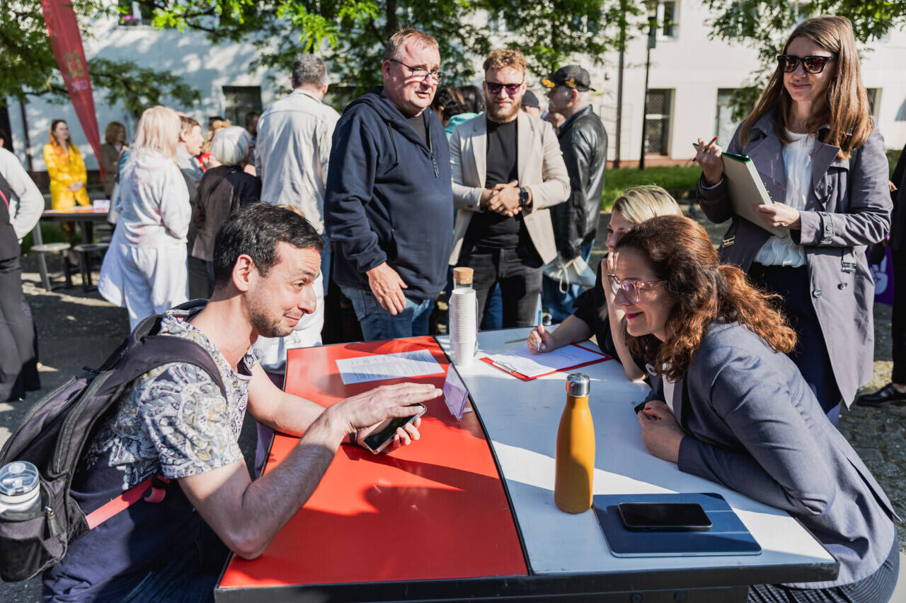 Gdańsk, plac gen. Stanisława Maczka u zbiegu ulic Chopina i Wojska Polskiego. Porozmawiajmy przy stole o dzielnicy Strzyża. W spotkaniu brali udział Aleksandra Dulkiewicz, prezydent Gdańska, zastępcy prezydenta oraz dyrektorzy wydziałów i miejskich jednostek organizacyjnych, a także radni miejscy i radni dzielnicy.