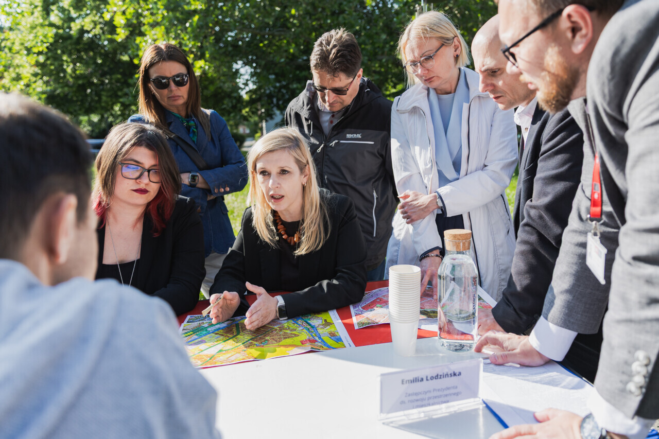 Gdańsk, plac gen. Stanisława Maczka u zbiegu ulic Chopina i Wojska Polskiego. Porozmawiajmy przy stole o dzielnicy Strzyża. W spotkaniu brali udział Aleksandra Dulkiewicz, prezydent Gdańska, zastępcy prezydenta oraz dyrektorzy wydziałów i miejskich jednostek organizacyjnych, a także radni miejscy i radni dzielnicy.