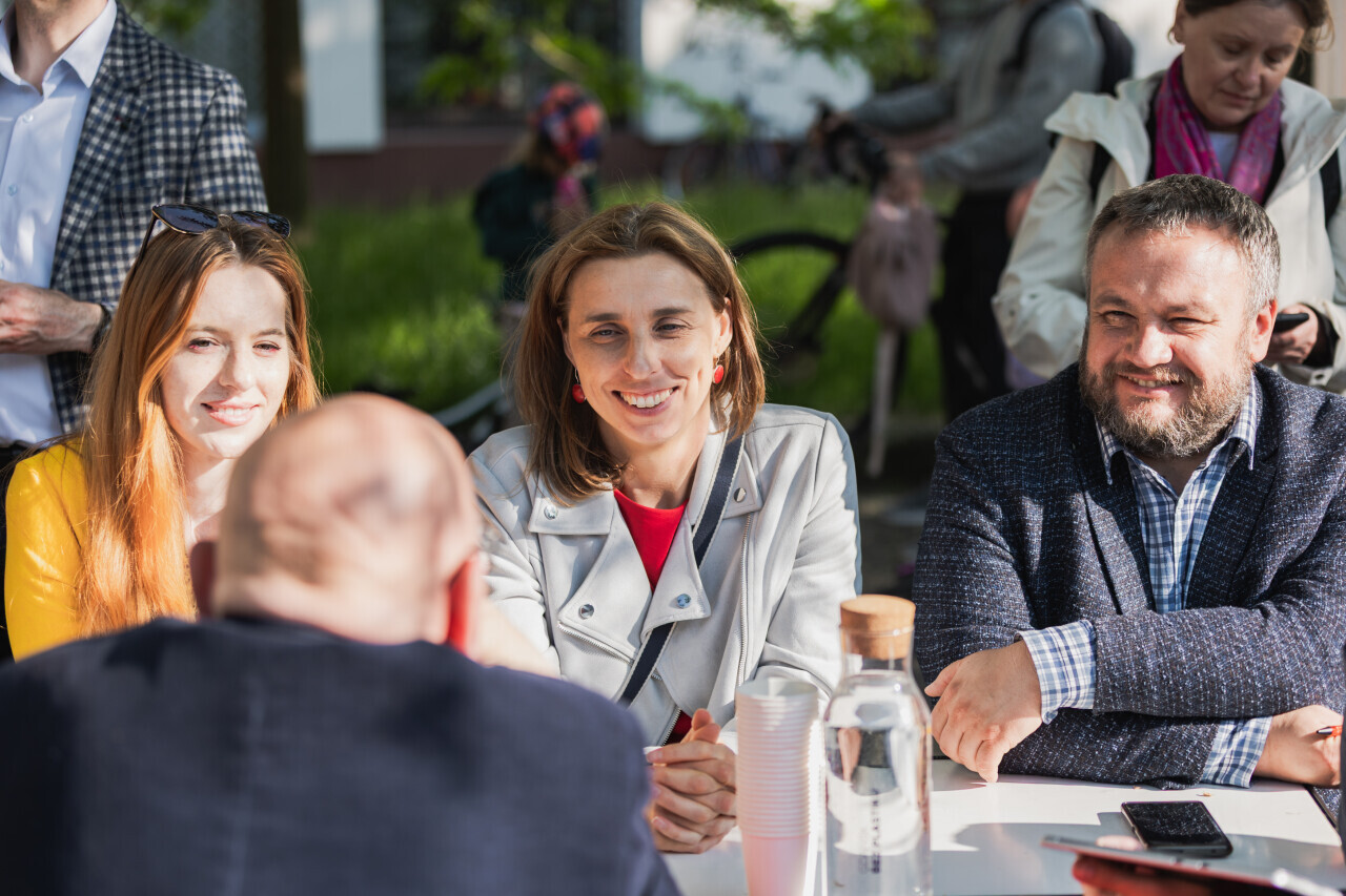 Gdańsk, plac gen. Stanisława Maczka u zbiegu ulic Chopina i Wojska Polskiego. Porozmawiajmy przy stole o dzielnicy Strzyża. W spotkaniu brali udział Aleksandra Dulkiewicz, prezydent Gdańska, zastępcy prezydenta oraz dyrektorzy wydziałów i miejskich jednostek organizacyjnych, a także radni miejscy i radni dzielnicy.