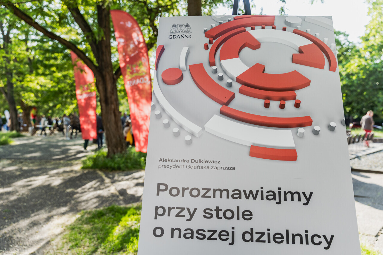 Gdańsk, plac gen. Stanisława Maczka u zbiegu ulic Chopina i Wojska Polskiego. Porozmawiajmy przy stole o dzielnicy Strzyża. W spotkaniu brali udział Aleksandra Dulkiewicz, prezydent Gdańska, zastępcy prezydenta oraz dyrektorzy wydziałów i miejskich jednostek organizacyjnych, a także radni miejscy i radni dzielnicy.