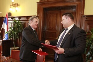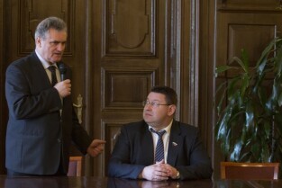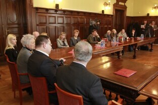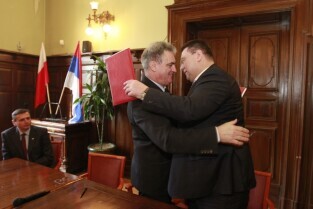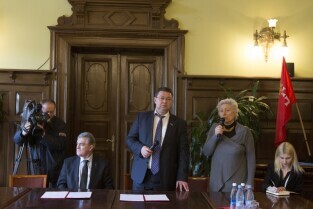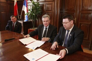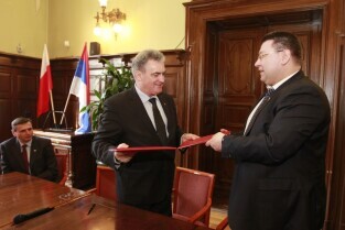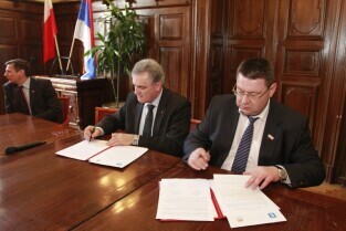 Przewodniczący Okręgowej Rady Deputowanych Miasta Kaliningradu Aleksander Piatikop i Przewodniczący Rady Miasta Gdańska Bogdan Oleszek podpisali porozumienie o współpracy obu miast. Gdańsk, Nowy Ratusz