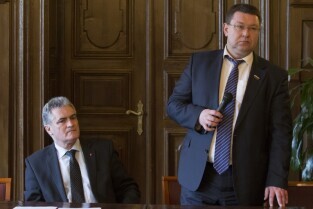 Przewodniczący Okręgowej Rady Deputowanych Miasta Kaliningradu Aleksander Piatikop i Przewodniczący Rady Miasta Gdańska Bogdan Oleszek (nz) podpisali porozumienie o współpracy obu miast. Gdańsk, Nowy Ratusz