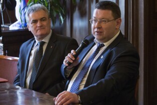 Przewodniczący Okręgowej Rady Deputowanych Miasta Kaliningradu Aleksander Piatikop (nz) i Przewodniczący Rady Miasta Gdańska Bogdan Oleszek podpisali porozumienie o współpracy obu miast. Gdańsk, Nowy Ratusz