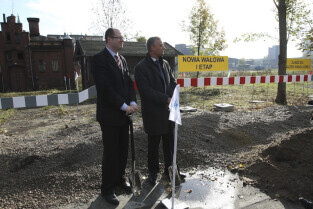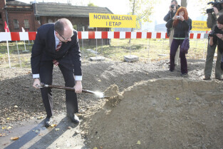 Podpisanie porozumienia Miasta Gdańska i Baltic Property Trust ws. budowy ul. Nowej Wałowej. Nz. Paweł Adamowicz, Prezydent Gdańska, symbolicznie rozpoczyna inwestycję