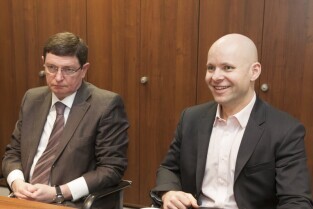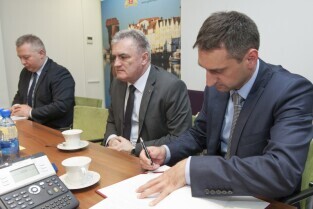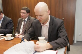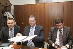 Podpisanie porozumienia pomiędzy Stocznią Gdańską, Miastem Gdańsk i Gdańską Agencją Rozwoju Gospodarczego w sprawie współpracy przy komercjalizacji terenów Stoczni Gdańskiej SA. Gdańsk, Urząd Miejski. Nz. od lewej: Dyrektor Departamentu Restrukturyzacji i Rozwoju Stoczni Gdańsk SA Maciej Mierzwiński, Przewodniczący Rady Nadzorczej Stoczni Gdańskiej Jarosław Łasiński, Prezes ISD Polska Kostiantyn Litwinow