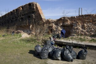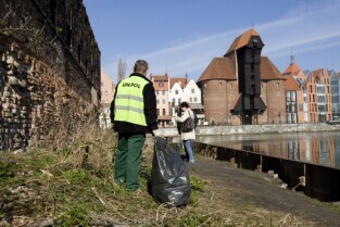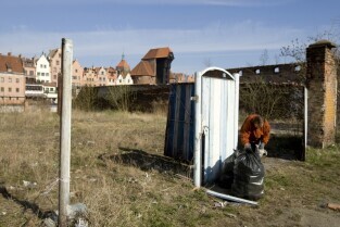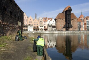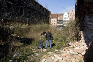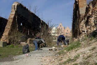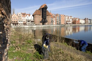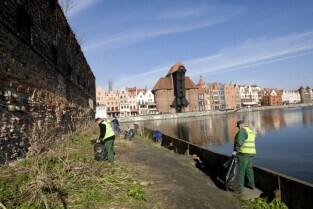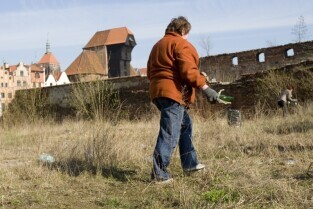 Prace porządkowe na północnej części Wyspy Spichrzów w Gdańsku. Pierwsza część polegająca na usunięciu śmieci, którą wykonują m.in. dłużnicy GZNK, więźniowie Zakładu Karnego na Przeróbce.
