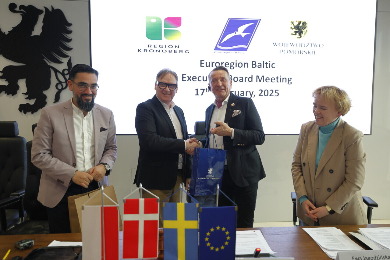 Gdańsk. Posiedzenie Prezydium Euroregionu Bałtyk w Gdańsku. Nz. Sławomir Demkowicz-Dobrzański, Rene Jaramillo, Leszek Bonna i Ewa Jagodzińska.