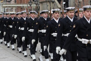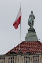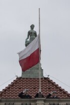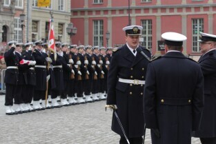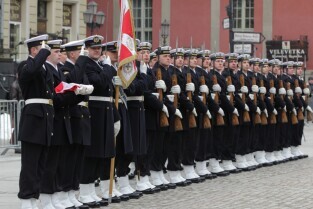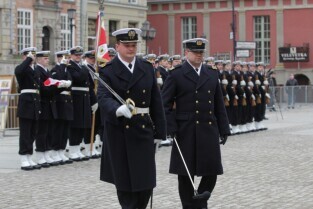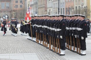 Obchody 68 Rocznicy Powrotu Gdańska do Macierzy. Długi Targu, uroczystość wciągnięcia flagi państwowej na maszt znajdujący się na Dworze Artusa.