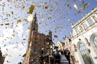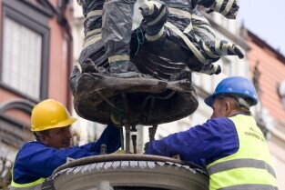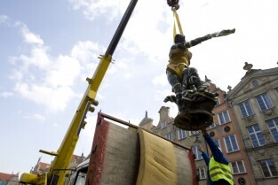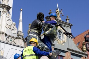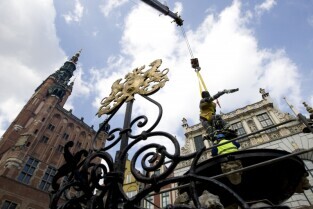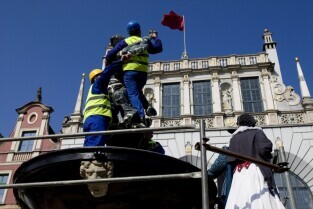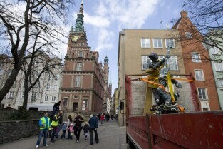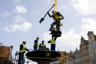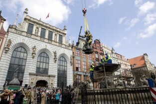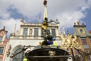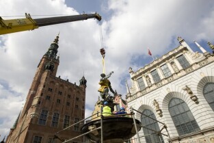 Gdańsk, Długi Targ. Montaż figury boga mórz Neptuna, który powrócił na fontannę po kompleksowym remoncie. Podczas prac konserwatorskich odnowiono posąg oraz przywrócono XVII-wieczny wygląd misy, wymieniono instalacje wodne i elektryczne, dodano nowoczesne oświetlenie LED.