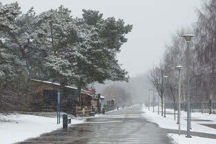 Gdańsk Zaspa, deptak w stronę mola. Powrót zimy pod koniec marca.