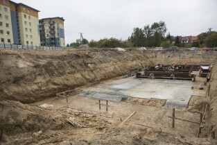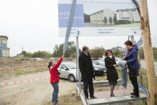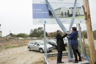 Uroczystość wmurowania kamienia węgielnego pod budowę zespołu budynków komunalnych. Gdańsk, ul. Madalińskiego. Nz. Prezes Gdańskiej Infrastruktury Społecznej Aleksandra Krzywosz (po prawej), Z-ca Prezydenta Gdańska Maciej Lisicki