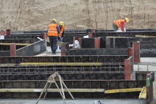 Uroczystość wmurowania kamienia węgielnego pod budowę zespołu budynków komunalnych. Gdańsk, ul. Madalińskiego. Nz. od lewej Prezydent Gdańska Paweł Adamowicz i Przewodniczący Rady Miasta Gdańska Bogdan Oleszek