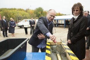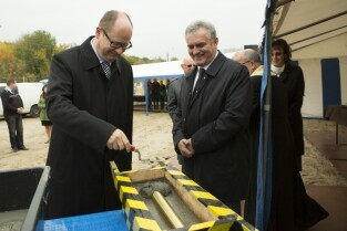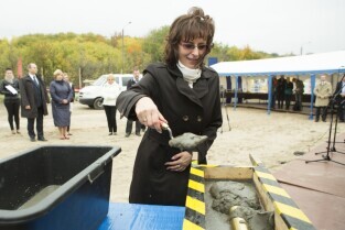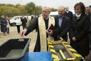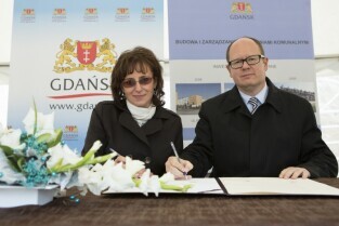 Uroczystość wmurowania kamienia węgielnego pod budowę zespołu budynków komunalnych. Gdańsk, ul. Madalińskiego. Nz. Prezes Gdańskiej Infrastruktury Społecznej Aleksandra Krzywosz i Z-ca Prezydenta Gdańska Maciej Lisicki