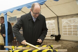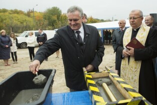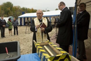 Uroczystość wmurowania kamienia węgielnego pod budowę zespołu budynków komunalnych. Gdańsk, ul. Madalińskiego. Nz. Prezydent Gdańska Paweł Adamowicz