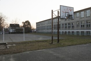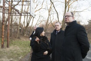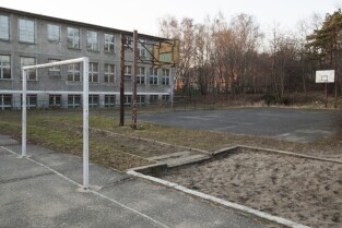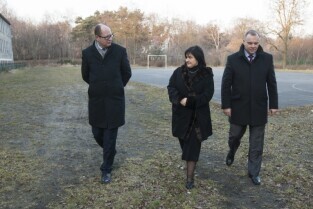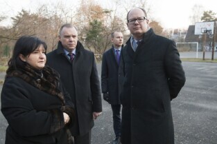 Gdańsk Stogi, Gimnazjum nr 11. Spotkanie Prezydenta Gdańska Pawła Adamowicza i Dyrektora Dyrekcji Rozbudowy Miasta Gdańska Włodzimierza Bartosiewicza z Dyrektor Gimnazjum nr 11 Dorotą Suchacz poświęcone budowie nowego przyszkolnego boiska o sztucznej nawierzchni, które powstanie w tym miejscu do września 2014 r. Na zdjęciu stan obecny boiska