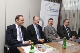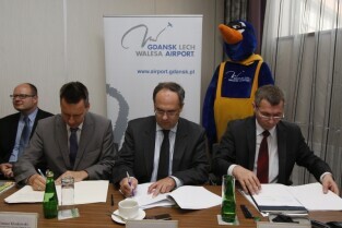 Podpisanie umowy pomiędzy Hilton Worldwide, spółką Port Hotel oraz Portem Lotniczym Gdańsk na dzierżawę przylotniskowego terenu, na którym zostanie wybudowany hotel sieci Hampton Hilton. Nz. od prawej: Prezes Port-Hotel Sp. z o.o. Mirosław Moczarski, Prezes Development Hilton Worldwide Urlich Widmer, Prezes Portu Lotniczego Gdańsk Tomasz Kloskowski