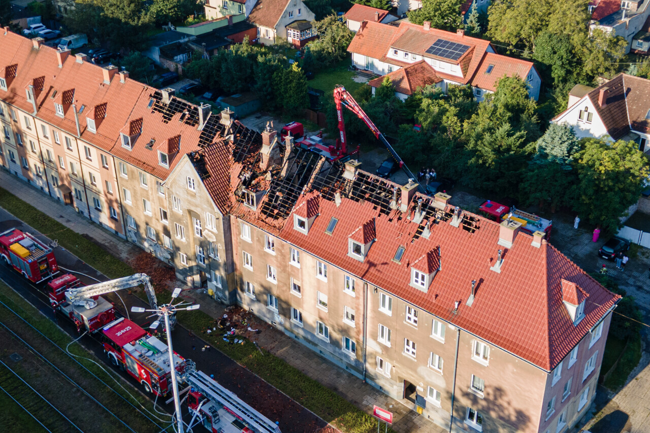 Gdańsk. 11 zastępów straży pożarnej dogaszalo zgliszcza po pożarze poddasza w kamienicy przy Al. gen. Józefa Hallera. Do tragedii doszło nad ranem, kiedy większość mieszkańców jeszcze spała. w pożarze zginęła jedna osoba
