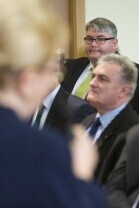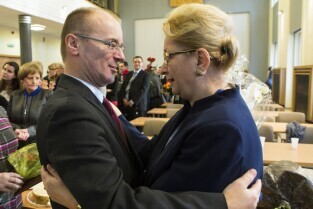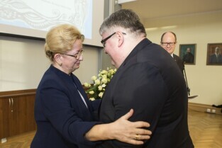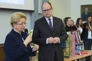 Urząd Miejski w Gdańsku. Pożegnanie Zastępcy Prezydenta Gdańska ds. polityki społecznej Ewy Kamińskiej oraz powołanie na to stanowisko Piotra Kowalczuka, dotychczasowego Dyrektora Wydziału Rozwoju Społecznego UMG. Nz. Ewa Kamińska i Wiceprzewodniczący Rady Miasta Gdańska Wojciech Błaszkowski