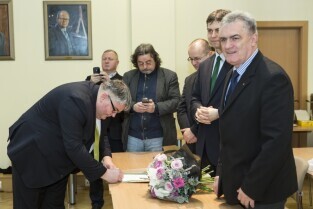 Urząd Miejski w Gdańsku. Pożegnanie Zastępcy Prezydenta Gdańska ds. polityki społecznej Ewy Kamińskiej oraz powołanie na to stanowisko Piotra Kowalczuka, dotychczasowego Dyrektora Wydziału Rozwoju Społecznego UMG. Nz. Prezydent Gdańska Paweł Adamowicz wręcza nominację na stanowisko Dyrektora Wydziału Rozwoju Społecznego UMG Grzegorzowi Szczuce