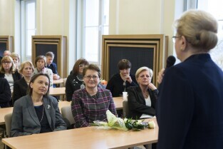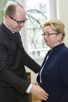 Urząd Miejski w Gdańsku. Pożegnanie Zastępcy Prezydenta Gdańska ds. polityki społecznej Ewy Kamińskiej oraz powołanie na to stanowisko Piotra Kowalczuka, dotychczasowego Dyrektora Wydziału Rozwoju Społecznego UMG. Nz. od lewej: Posłanka na Sejm RP Katarzyna Hall, Pomorski Kurator Oświaty Elżbieta Wasilenko, Sekretarz Miasta Gdańska Danuta Janczarek