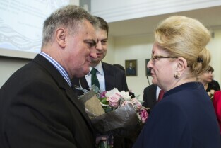 Urząd Miejski w Gdańsku. Pożegnanie Zastępcy Prezydenta Gdańska ds. polityki społecznej Ewy Kamińskiej oraz powołanie na to stanowisko Piotra Kowalczuka, dotychczasowego Dyrektora Wydziału Rozwoju Społecznego UMG. Nz. Ewa Kamińska i Przewodniczący Rady Miasta Gdańska Bogdan Oleszek