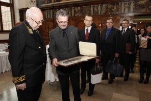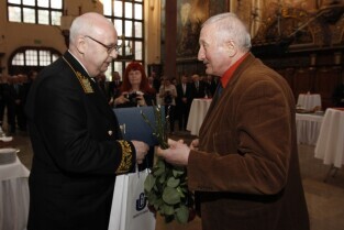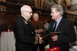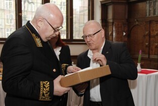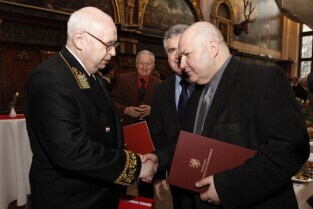 Gdańsk, Dwór Artusa. Oficjalne pożegnanie Konsula Federacji Rosyjskiej w Gdańsku Sergieja Puczkowa, który kończy swoją misję dyplomatyczną w Polsce. Nz. Konsul Sergiej Puczkow i W-ce Marszałek Woj. Pomorskiego Wiesław Byczkowski (po prawej)