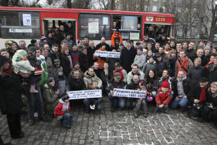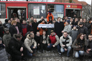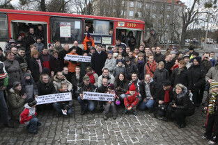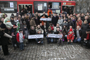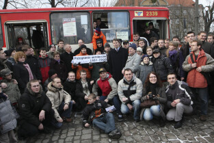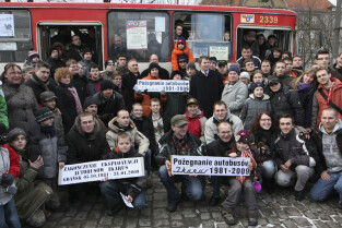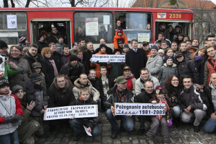 Ostatni kurs autobusu Ikarus w Gdańsku, który odbył się na trasie linii 142. Nz. wspólna pamiatkowa fotografia