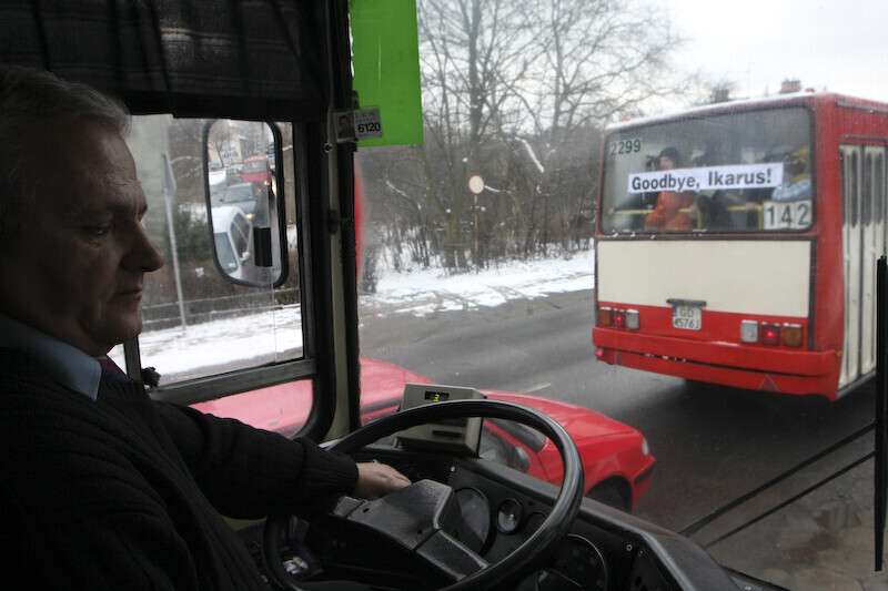 Ostatni kurs autobusu Ikarus w Gdańsku, który odbył się na trasie linii 142. Nz. kierowca Jaroslaw Zurowski