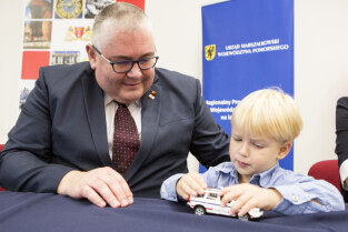 Gdańsk ul. Świętokrzyska, Publiczne Pozytywne Przedszkole nr 4. Inauguracja projektu "Pozytywne Przedszkola Pomorza" połączona z otwarciem tej placówki. Nz. Marszałek Woj. Pomorskiego Mieczysław Struk z przedszkolakiem Michałem