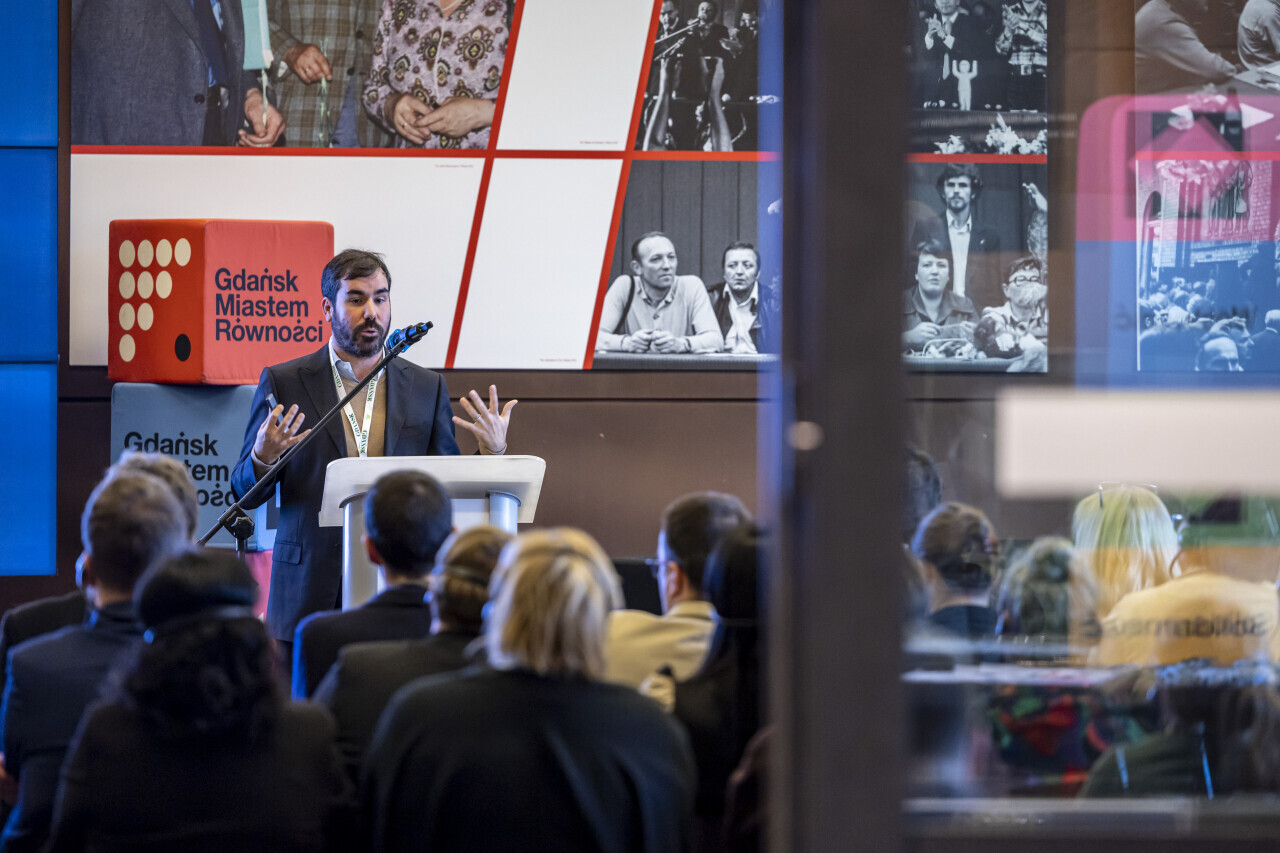 Gdańsk. Minister Katarzyna Kotula, Prezydent Aleksandra Dulkiewicz oraz jej zastępczyni Monika Chabior, radne Marta Magott i Żaneta Geryk, a także Dyrektor ECS'u Basil Kerski wzięli udział w odbywającej się w Europejskim Centrum Solidarności konferencji pod hasłem "Prawa człowieka w praktyce Samorządowej"