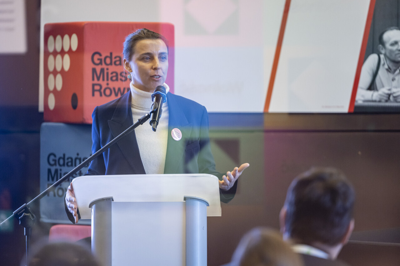 Gdańsk. Minister Katarzyna Kotula, Prezydent Aleksandra Dulkiewicz oraz jej zastępczyni Monika Chabior, radne Marta Magott i Żaneta Geryk, a także Dyrektor ECS'u Basil Kerski wzięli udział w odbywającej się w Europejskim Centrum Solidarności konferencji pod hasłem "Prawa człowieka w praktyce Samorządowej"